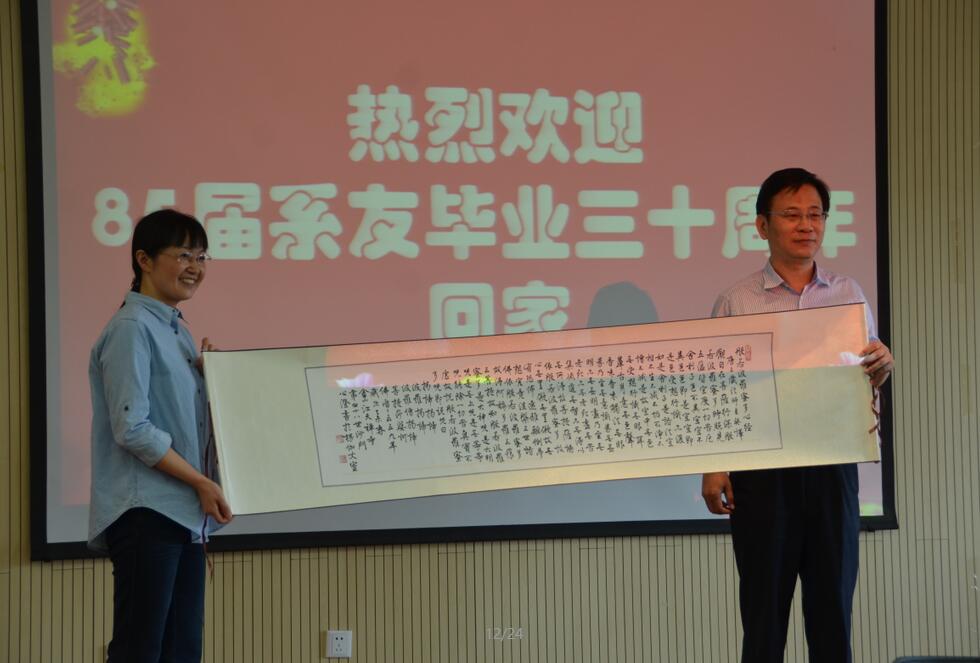 在周书记发言完毕之后,85届系友代表李国华代表85届系友,向母系赠送中国佛教协会副会长、江苏省佛教协会会长心澄法师手书《心经》一幅,以感谢母系对同学们的悉心培养。
