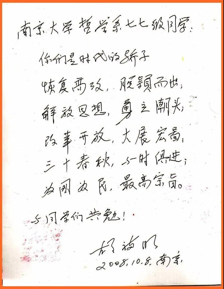 在这10年间,南大哲学系以许多“第一”、“唯一”而名垂史册:名列“第一中的第一”“唯一中的唯一”的,无疑是胡福明老师作为原作者的宏文《实践是检验真理的唯一标准》,它的公开发表揭开了中国解放思想、改革开放的序幕,无愧于40年后获得国家授予的“改革先锋”称号;硕士生宋龙祥以“马丁”署名发表《当代我国经济学研究的十大转变》,在国内学术界产生了重大影响;作为南大新学科、新院系的“孵化器”,哲学系先后“生”出了经济学系、法律系、政治学系、社会学系,现在分别发展为商公司、法公司、政府管理公司、社会公司;负责全校文科发展规划与管理的社会科学处,刚刚成立时只有3个人——韩新民、周爱群和我,竟然都是毕业于哲学系;经当时在解放军第1军第2师服役的同班同学薛国友的牵线搭桥,哲学系开办了全国第一个“军营大专班”,为军队培养高层次人才,此举得到解放军总政治部和国家教委的肯定和推广;以本系马克思主义哲学专业为依托,主办全国首届马克思主义哲学博士生导师研讨会,开启了国内马克思主义哲学最高培养层次的交流机制;由本系青年教师和研究生牵头,在太湖之滨举办了全国首届哲学青年学者论坛;本系在读本科生最早呼出“今日我以南大为荣,明日南大以我为荣”的口号,这条标语至今都是南大校园内最亮丽的一道风景线。