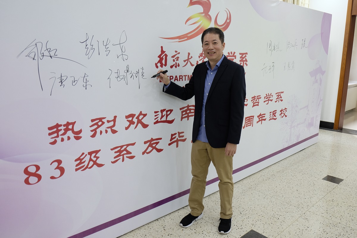 紧接着,87届系友,也是南哲现任系主任唐正东老师介绍了目前南哲的情况:“哲学系工作做得好都是前辈老师们打下的基础。总体来说,毕业三十年来,南哲进步非常大。硬件方面,仙林校区有了独立的哲学楼。我们哲学系虽然规模不大,但是精干,所以说‘有系有戏’嘛!软件方面,南哲最近进入了国家一流团队建设行列,可以预见到更为灿烂的明天。”唐老师就系友们对南哲的支持表示感谢。