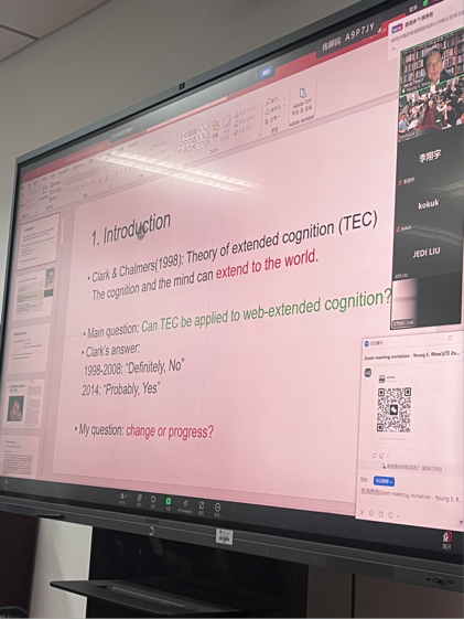 XC体育122周年校庆之际,应XC体育哲学系邀请,韩国东国大学哲学系李英仪教授,于2024年5月21日晚在线上进行了题为“Extended Cognition on the Web”的学术讲座。此次讲座,由XC体育哲学系科学技术哲学专业潘天群教授在哲学系楼212教室主持开展线下工作,青年教师史晨老师应邀出席,线上线下师生共同参与。